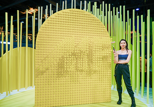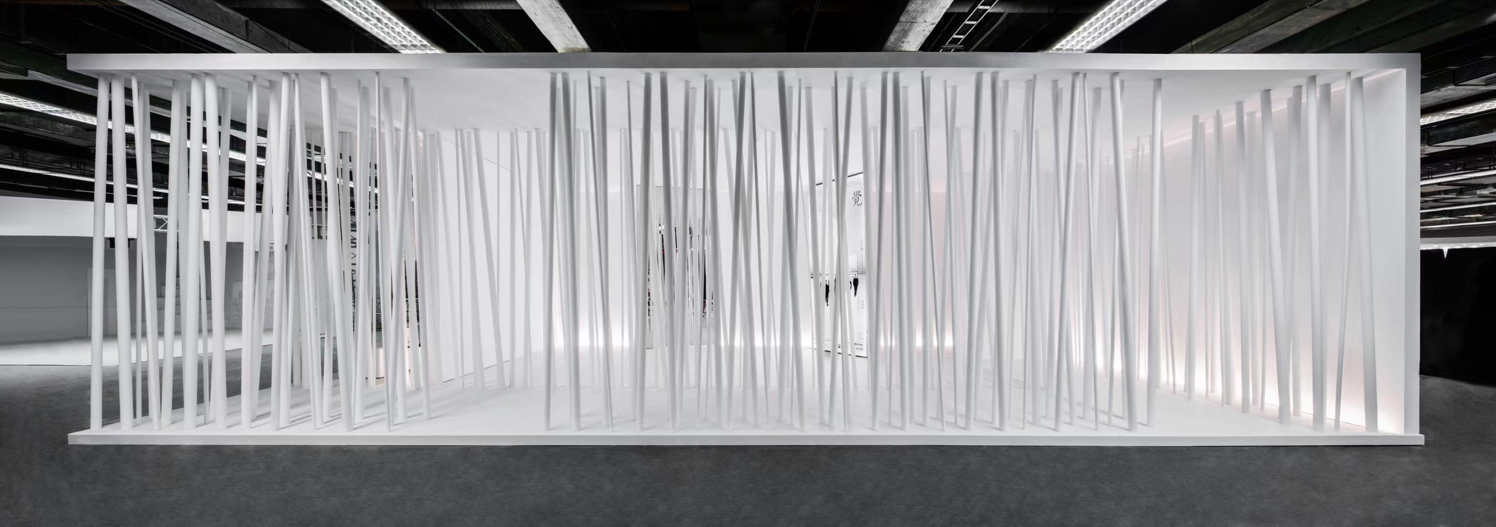 展位运用简洁的线、面结构,为空间提供思考媒介。空间中自由交错的白色立柱,是对“江南竹林秘境”的抽象化表达。以沉浸式影像释放内在能量,将生活的畅想转化为可感知的视觉语言,激发不可复制的生命力。