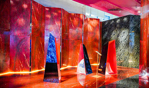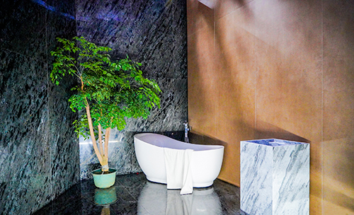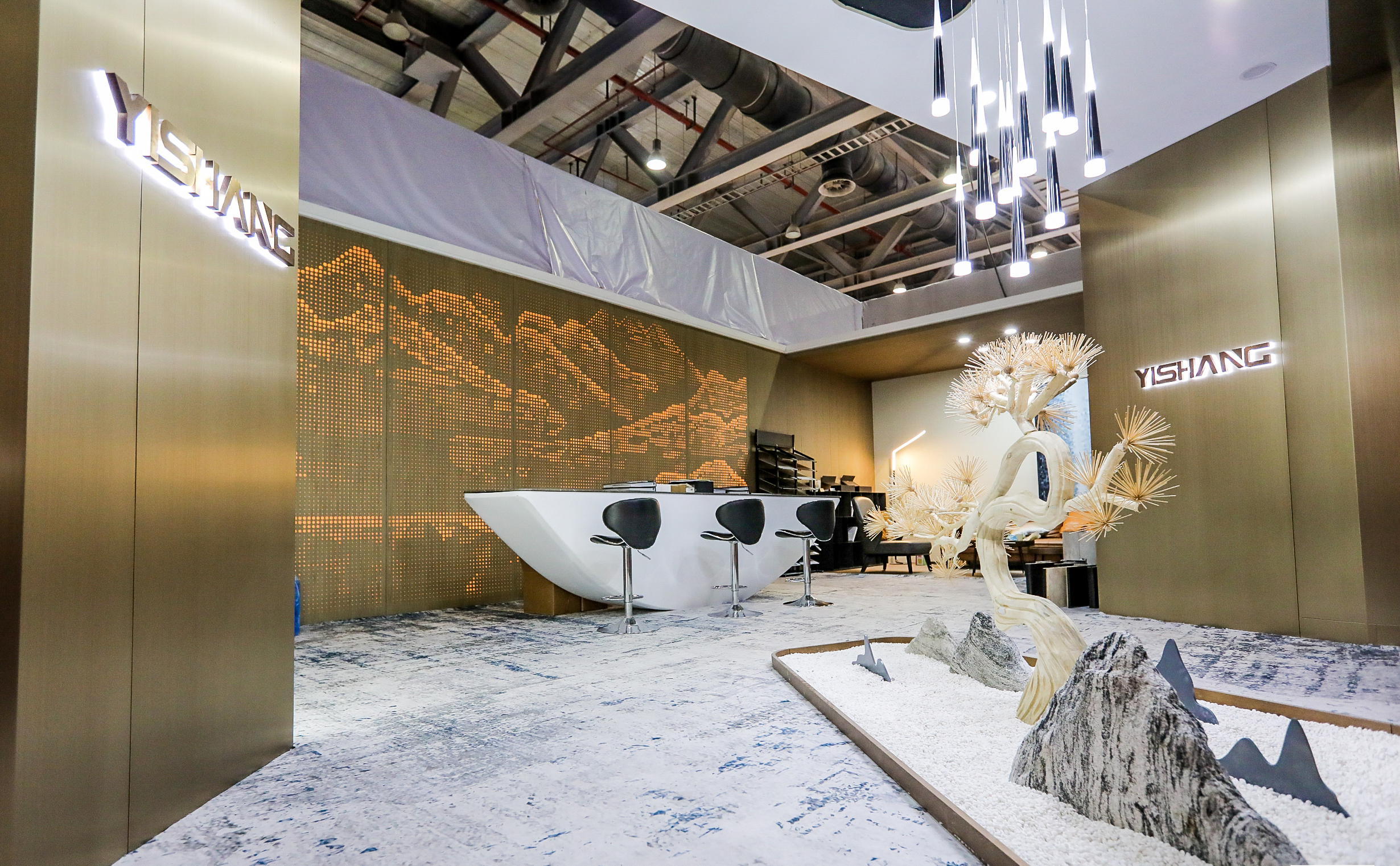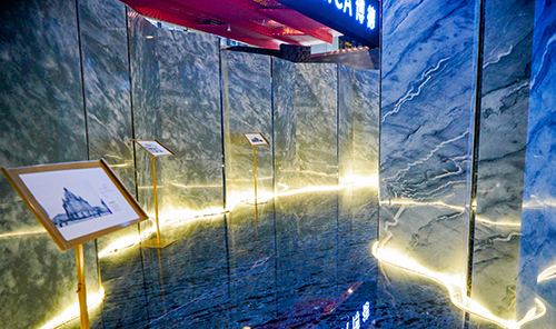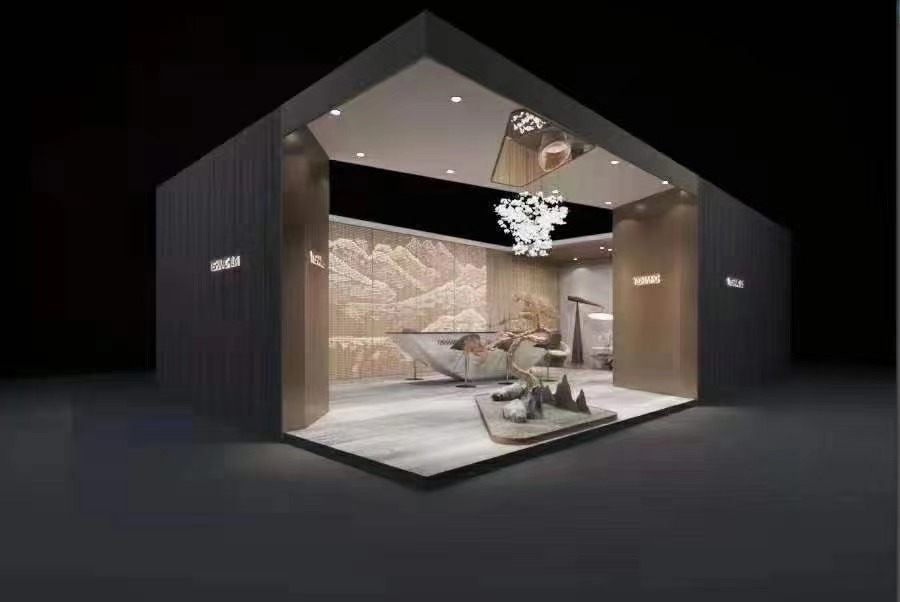 展位设计以新颖的方式结合了视觉艺术、空间设计、光线等多种艺术方式,重塑新的空间理念。以新材料作为突破点,通过各种大规格产品与充满神秘感的艺术元素相结合,打破固有空间的物理界限,让参观者在空间里去探索未来家居的新境界以及思考人与自然该如何自然相处。