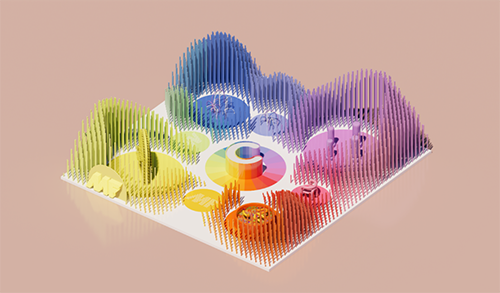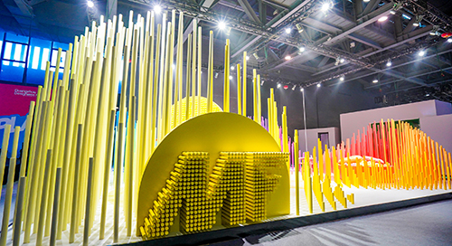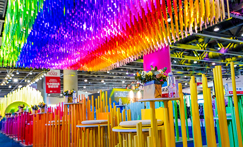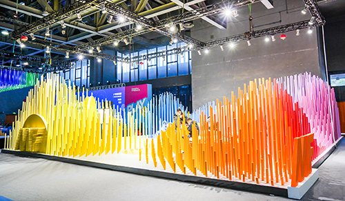 设计摒弃了常规的展厅墙体,将阵列穿插的圆管延伸至整个展厅空间,通过安插不同高度的圆管制作出立体起伏的山川造型,并以MF品牌多样化的渐变色彩为基础,将展台拼装成一幅立体的彩色山水画。
