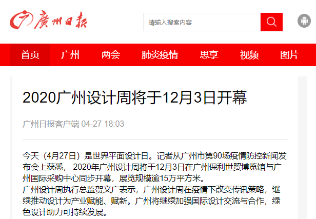 作为亚洲首屈一指的设计产业盛会,广州设计周在前不久的4月27日便应广州市委宣传部邀请在广州市第90场疫情防控新闻发布会上进行了2020广州设计周展会项目发布,广州设计周联合创始人张卫平先生、广州设计周CEO贺文广先生出席会议,并就2020广州设计周有关情况做了详细阐述,受到广州市委宣传部的高度认可和大力支持,纷纷表示对12月3-6日如期举办的2020广州设计周展会期待满满,《广州日报》等各路官方媒体更是拿出重要版面官宣报道。